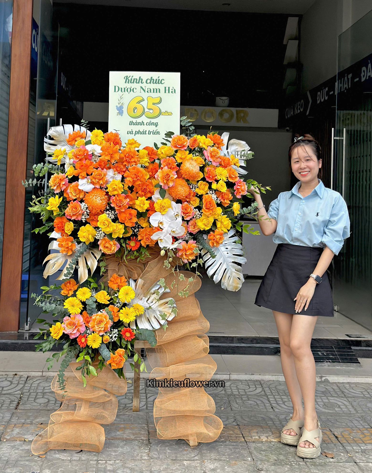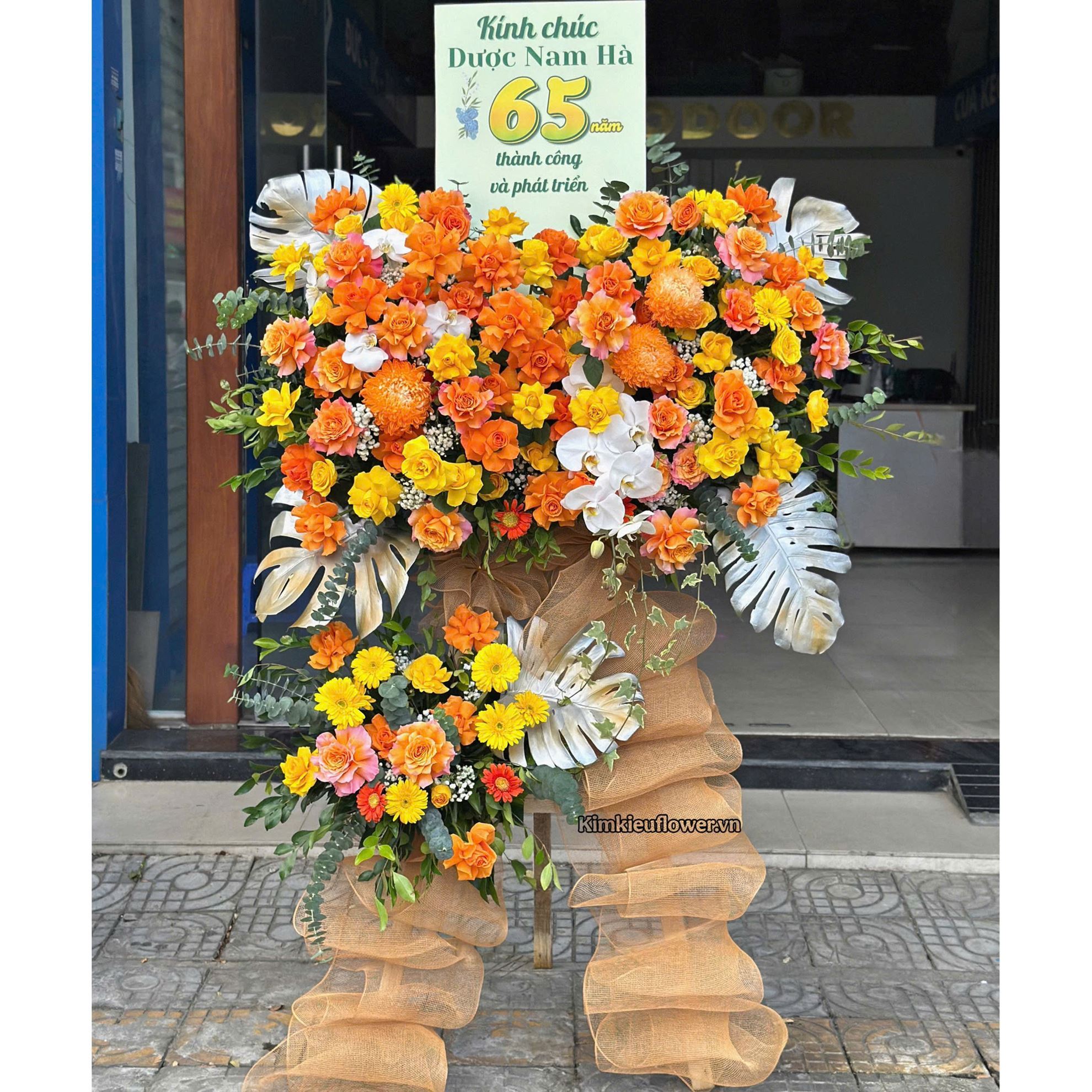 Mẫu KH483 gồm các loại hoa: + 3 cúc mẫu đơn + 58 hồng cam + 1 cành lan hồ điệp, 4 hoa lan hồ điệp + 35 hồng vàng + 10 đồng tiền nhí vàng, 3 đồng tiền cam + và các lá phụ khác - Liên hệ KIM KIỀU FLOWER để tư vấn thiết kế mẫu hoa theo yêu cầu bạn nhé!