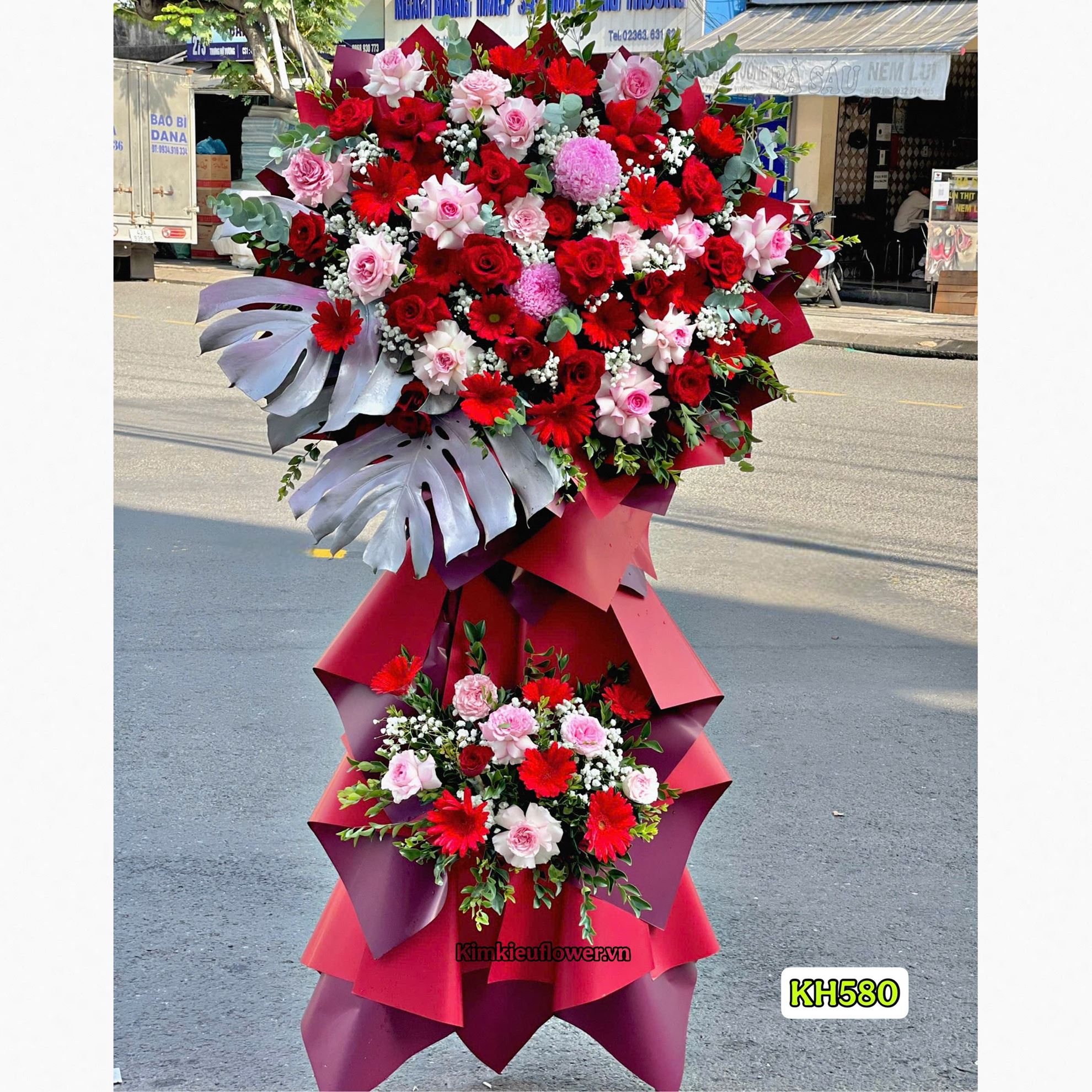 Kệ hoa chúc mừng tone đỏ hồng mix cúc mẫu đơn - KH580
