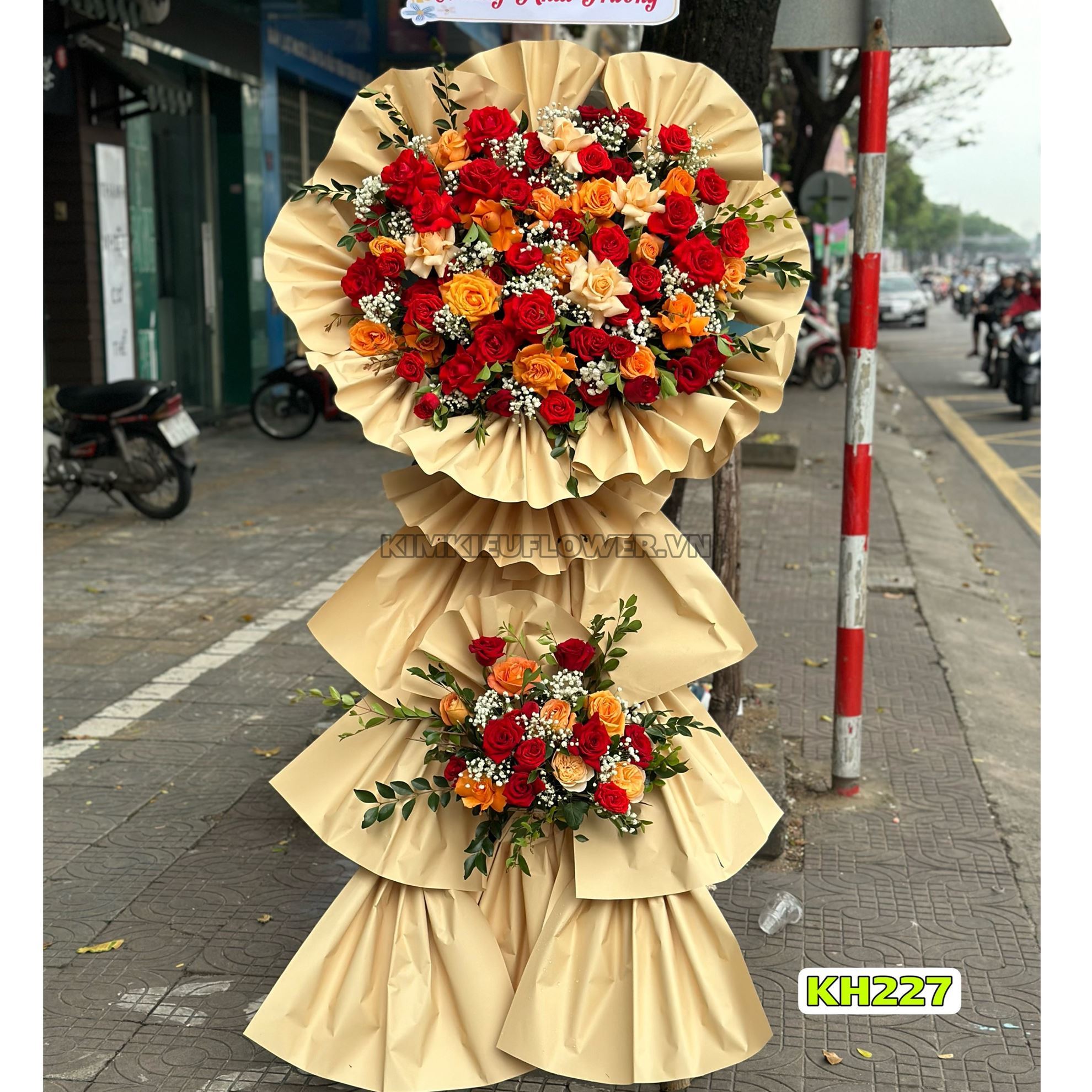 Kệ hoa chúc mừng KH227 gồm + 50 Hoa hồng đỏ + 21 Hoa hồng cam + 5 Hoa hồng mỡ gà + và các hoa, lá phụ khác - Liên hệ KIM KIỀU FLOWER để tư vấn thiết kế mẫu hoa theo yêu cầu bạn nhé!