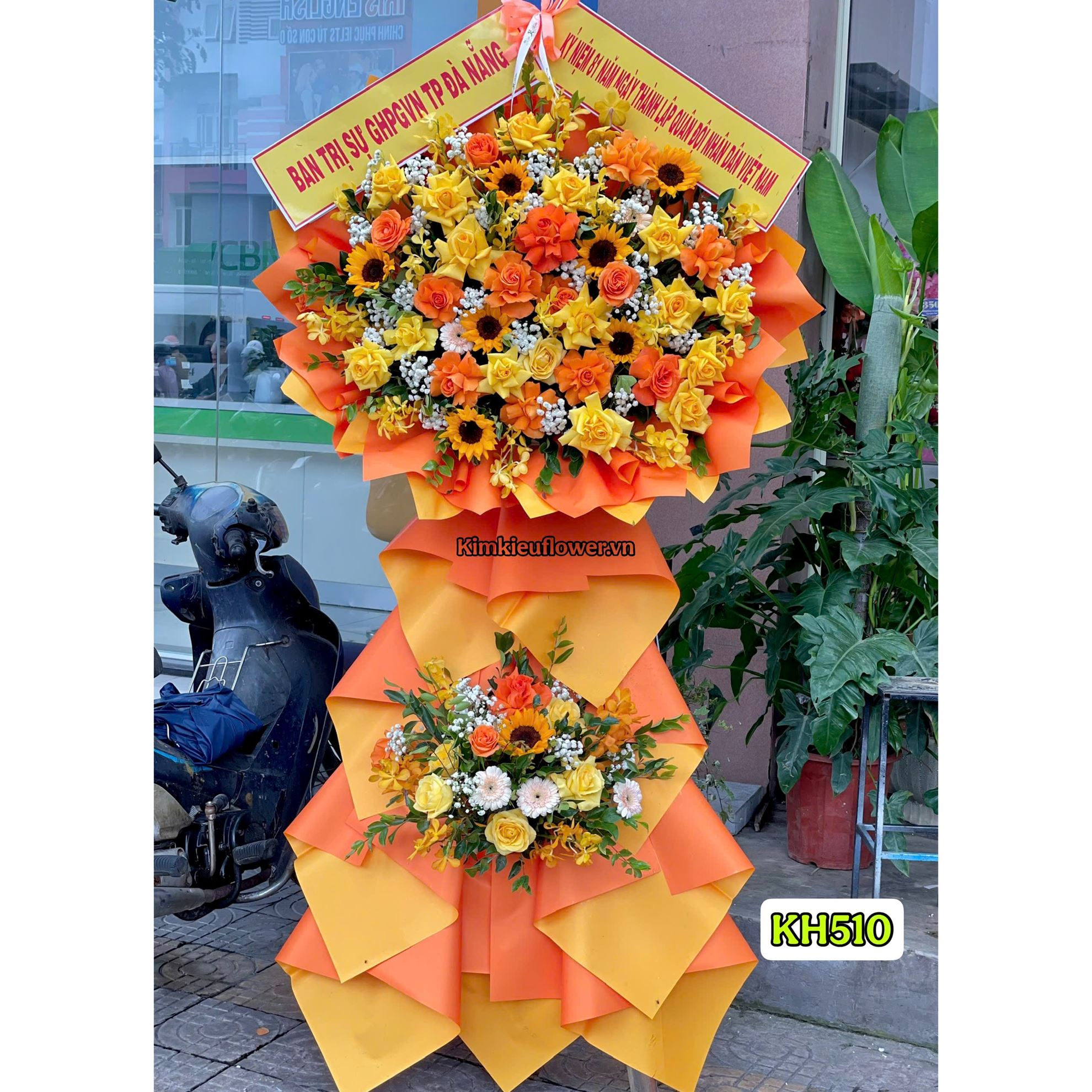 Kệ hoa chúc mừng tone vàng cam mix hướng dương - KH510