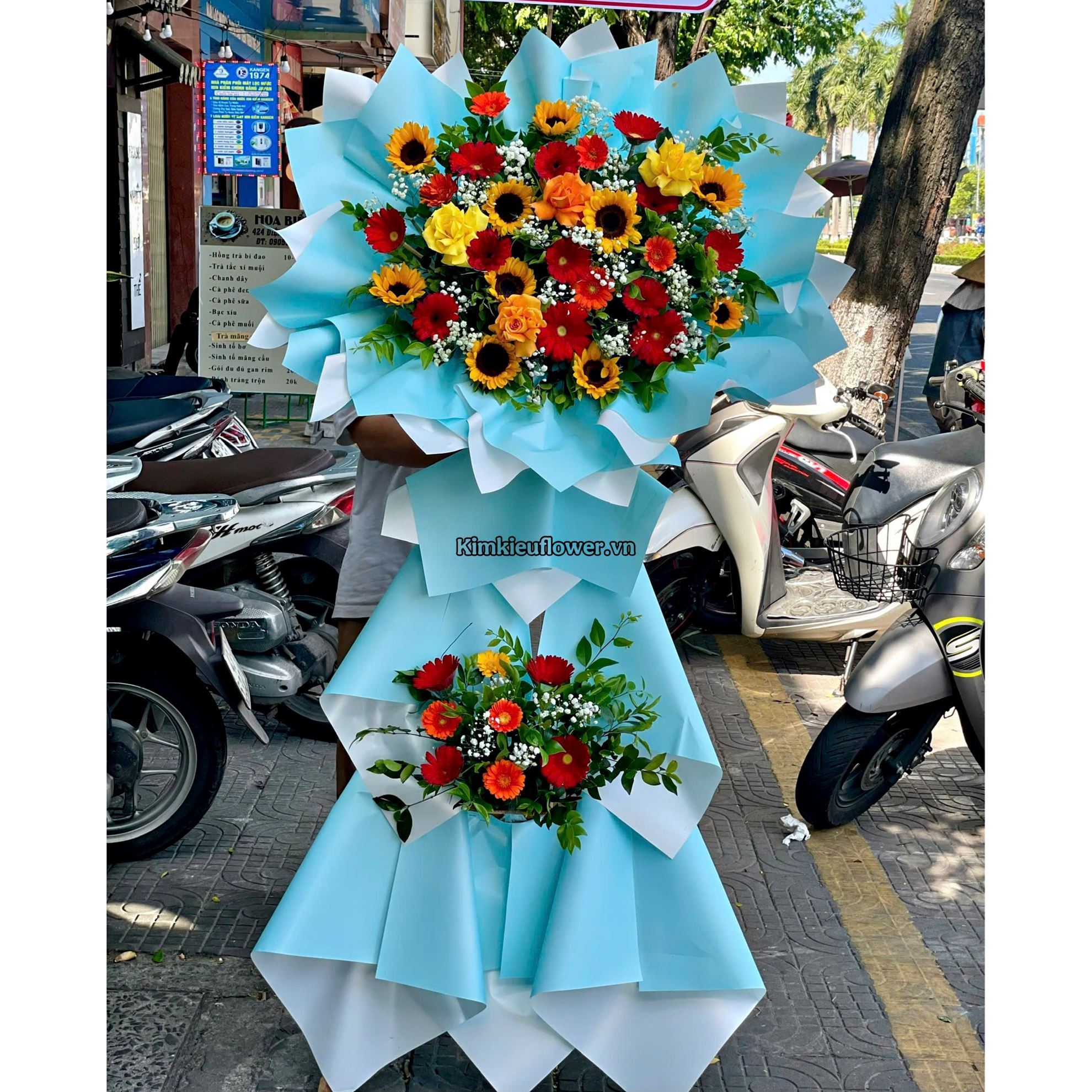 Mẫu KH209 gồm các loại hoa : + 10 hoa hướng dương + 12 hoa đồng tiền đỏ, 1 đồng tiền vàng, 7 đồng tiền cam + 2 hoa hồng cam + 2 hồng vàng + và các lá phụ khác - Liên hệ KIM KIỀU FLOWER để tư vấn thiết kế mẫu hoa theo yêu cầu bạn nhé!