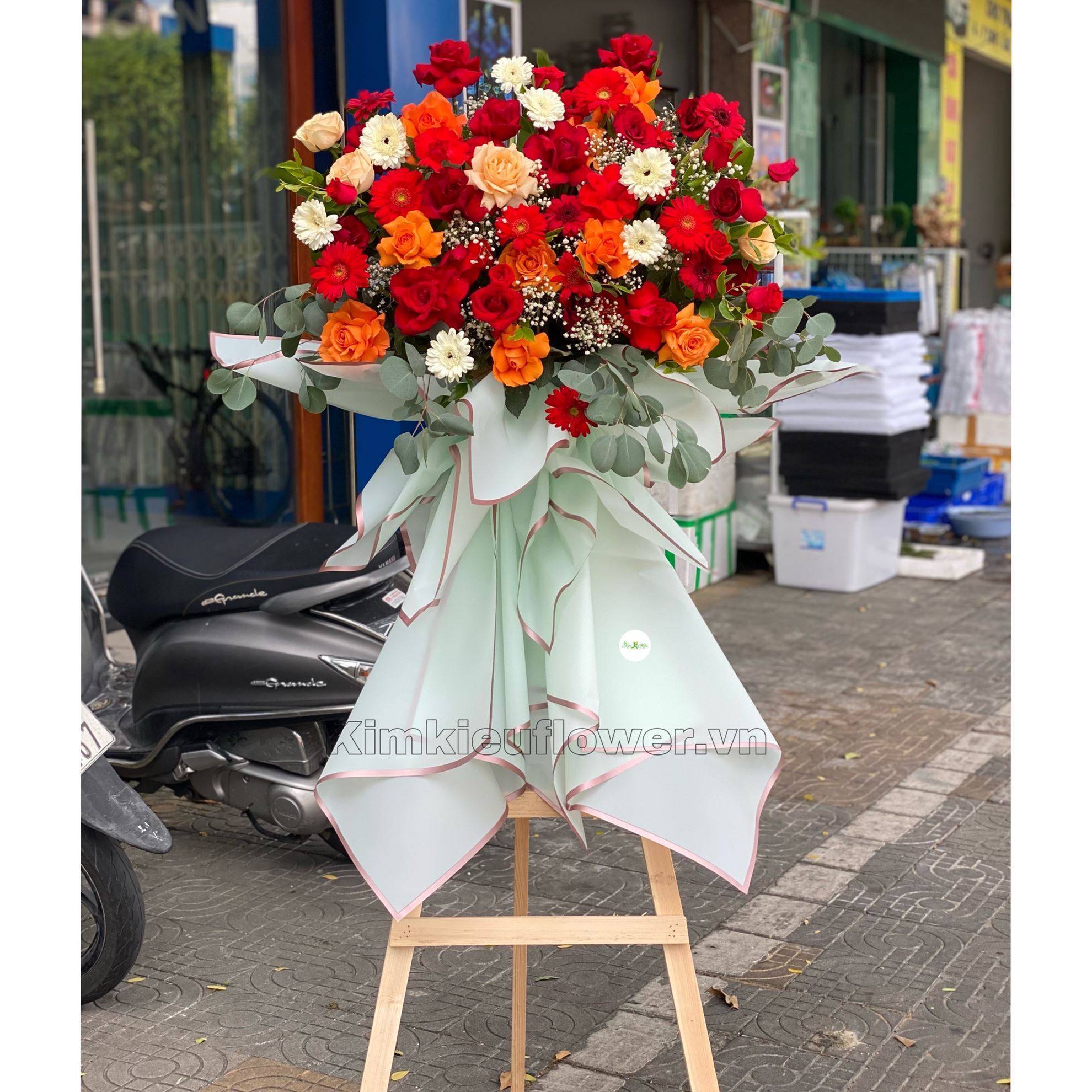 Mẫu KH131 gồm các loại hoa: + 28 hoa hồng đỏ + 9 hồng cam + 4 hồng mỡ gà + 11 đồng tiền đỏ, 7 đồng tiền trắng + và các hoa,lá phụ khác - Liên hệ KIM KIỀU FLOWER để tư vấn thiết kế mẫu hoa theo yêu cầu bạn nhé!