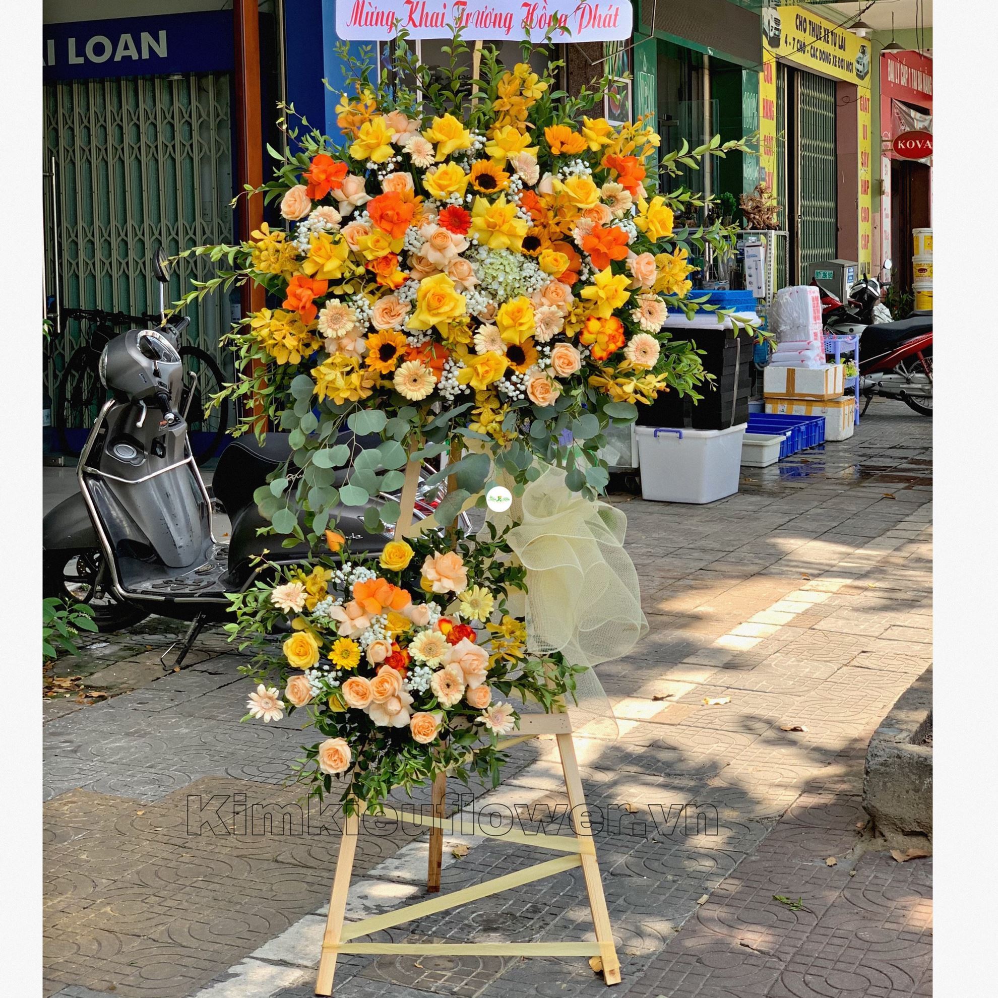 Mẫu KH140 gồm các loại hoa: + hoa hồng vàng + hướng dương + hoa hồng mỡ gà + lan vàng + cẩm tú cầu + và các lá phụ khác - Liên hệ KIM KIỀU FLOWER để tư vấn thiết kế mẫu hoa theo yêu cầu bạn nhé!