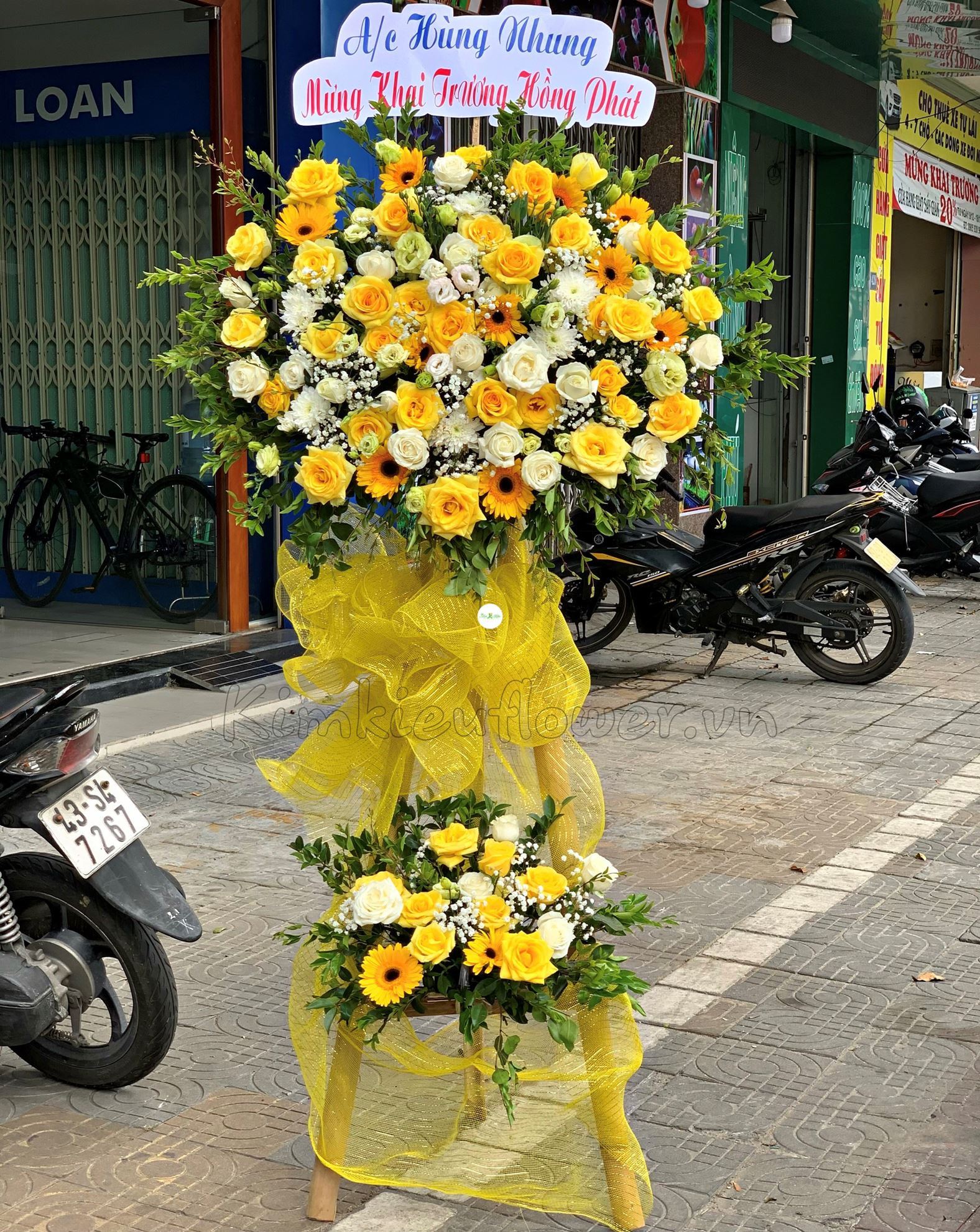 Mẫu KH76 gồm các loại hoa: + hoa hồng vàng + cát tường xanh + hoa hồng trắng + hoa đồng tiền vàng + và các hoa,lá phụ khác- Liên hệ KIM KIỀU FLOWER để tư vấn thiết kế mẫu hoa theo yêu cầu bạn nhé!