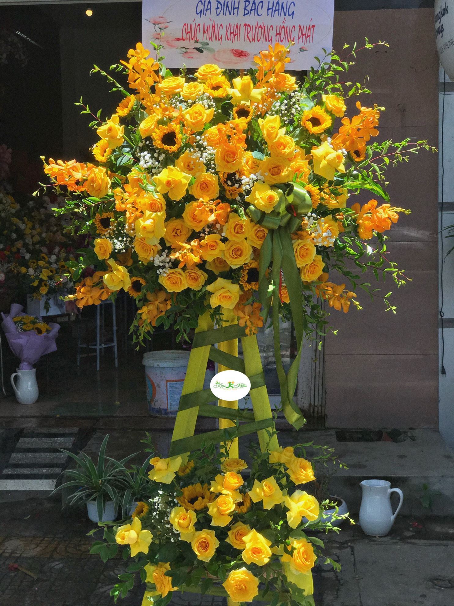 Mẫu KH03: Kệ hoa thể hiện lòng chân thành đến với đối tác, các công ty, lấy tone màu chủ đạo là màu vàng, làm nên từ hoa hồng vàng, hướng dương vàng, lan vàng cùng cách thiết kế tinh tế, hiện đại và sang trọng. Kệ hoa không chỉ đẹp mà còn mang lời chúc mừng thành công, vươn xa và phát triển không ngừng. - Mẫu KH03 gồm các loại hoa: + hoa hồng vàng + hoa hướng dương + lan vàng + baby Hà Lan giống nhập + và các hoa,lá phụ khác - Liên hệ KIM KIỀU FLOWER để tư vấn thiết kế mẫu hoa theo yêu cầu bạn nhé!