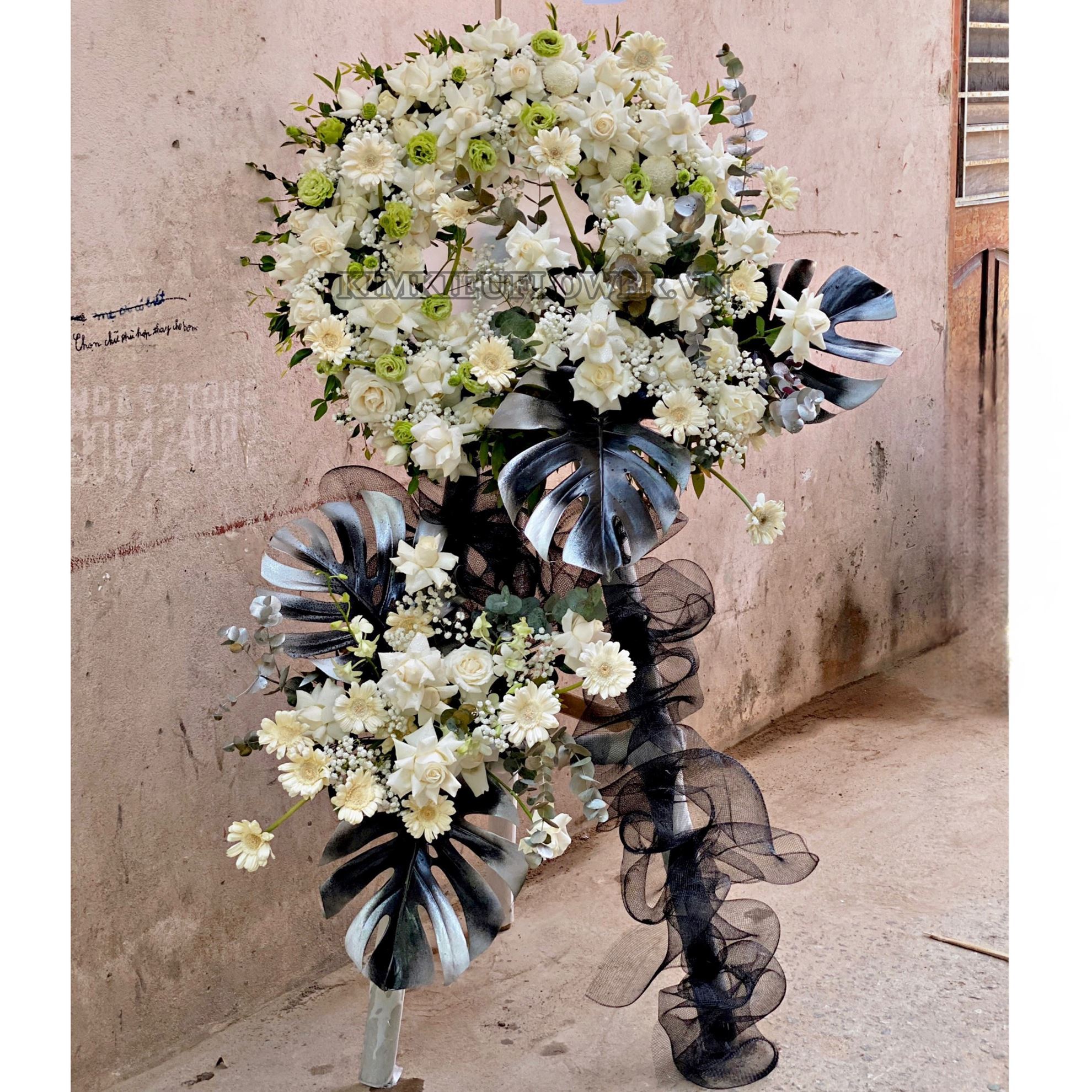 Kệ hoa KV201 gồm: + Hoa hồng trắng + Đồng tiền trắng + Cát tường xanh + và các lá phụ khác - Liên hệ KIM KIỀU FLOWER để tư vấn thiết kế mẫu hoa theo yêu cầu bạn nhé!