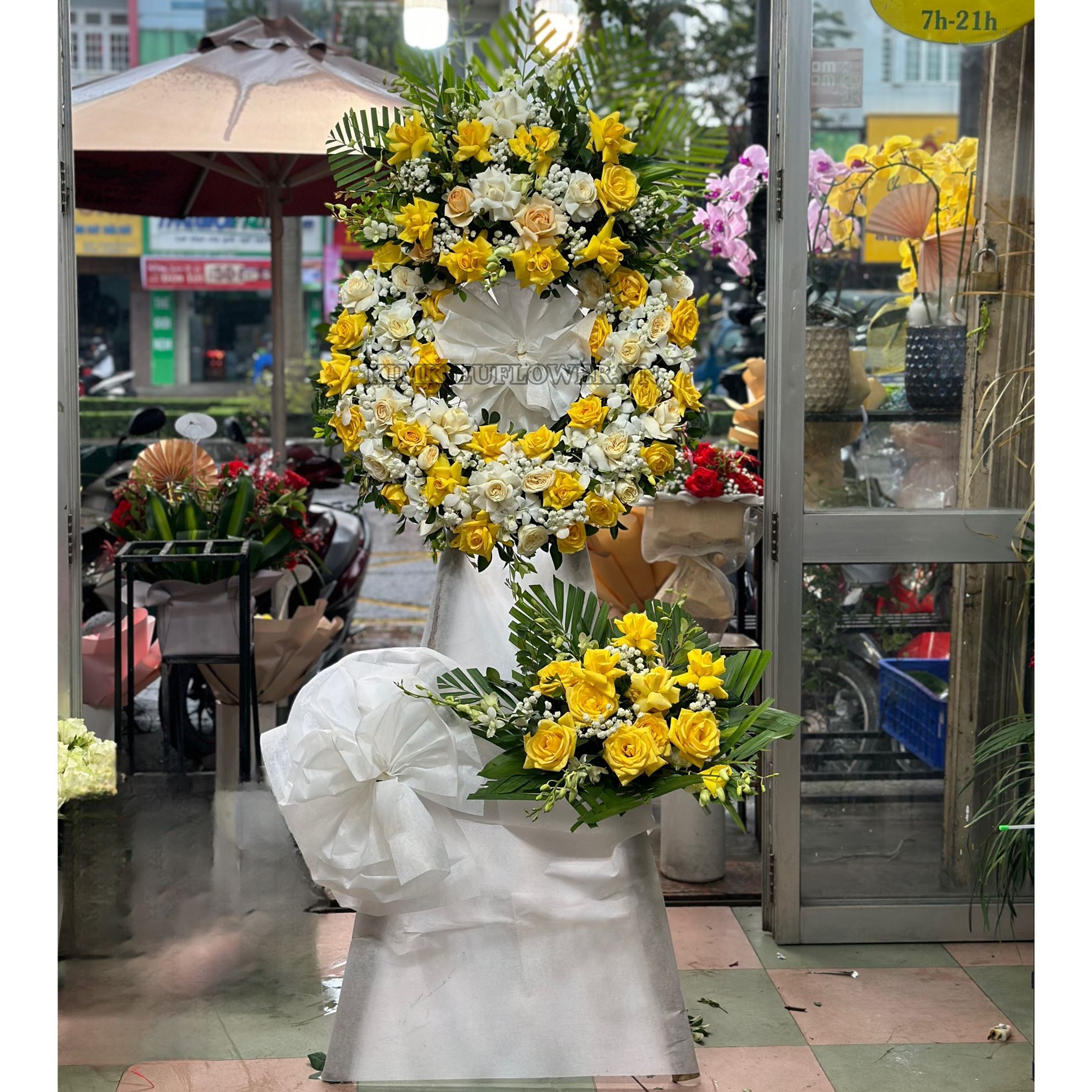 Kệ vòng viếng KV200 gồm: + Hoa hồng vàng + Hoa hồng trắng + Lan trắng + và các lá phụ khác - Liên hệ KIM KIỀU FLOWER để tư vấn thiết kế mẫu hoa theo yêu cầu bạn nhé!