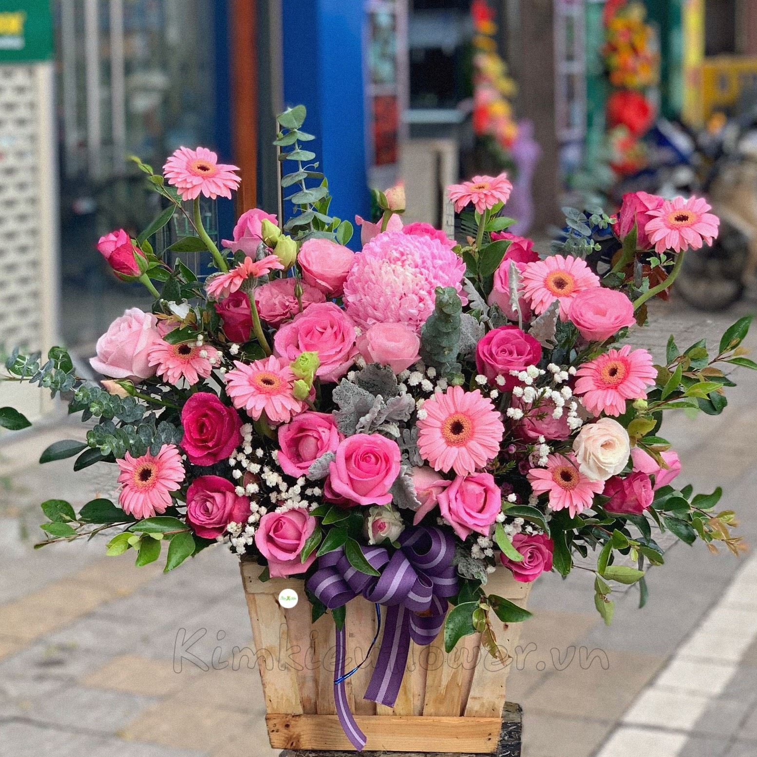 Lẵng hoa cúc mẫu đơn, đồng tiền nhí hồng- HG167