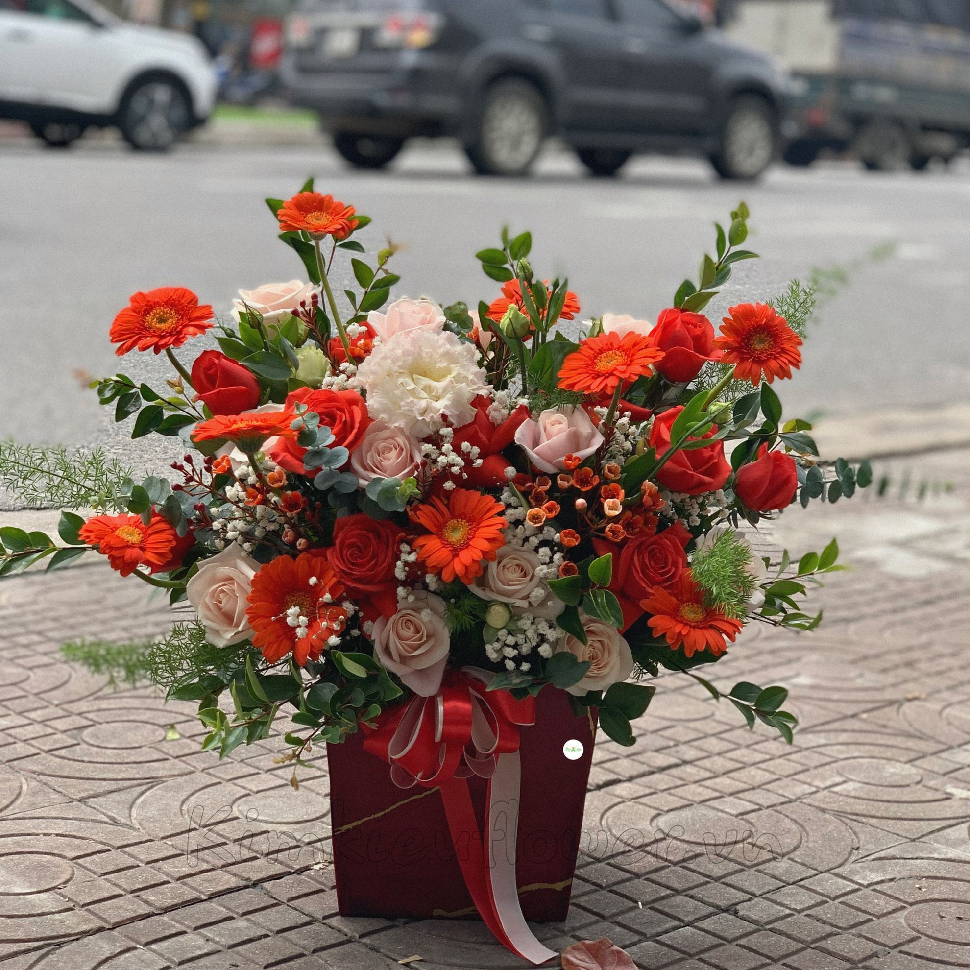 Mẫu HG162: Gồm các loại hoa: + hoa đồng tiền cam + hoa cam ớt + hoa hồng pastel + và các lá phụ khác - Liên hệ KIM KIỀU FLOWER để tư vấn thiết kế mẫu hoa theo yêu cầu bạn nhé!