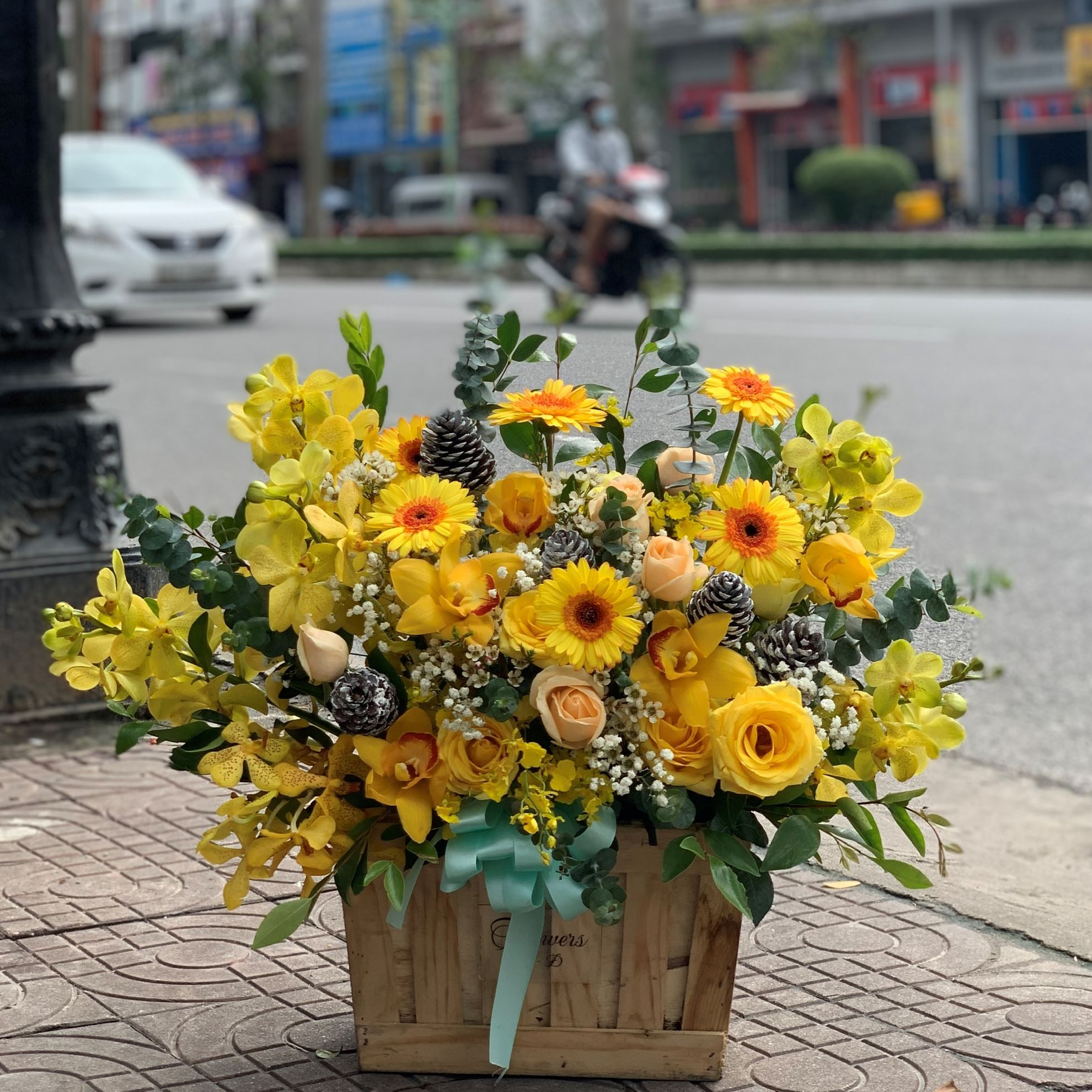 Mẫu HG164 gồm các loại hoa: + hoa đồng tiền + hoa hồng mỡ gà + địa lan + lan vàng mokara + và các lá phụ khác - Liên hệ KIM KIỀU FLOWER để tư vấn thiết kế mẫu hoa theo yêu cầu bạn nhé!
