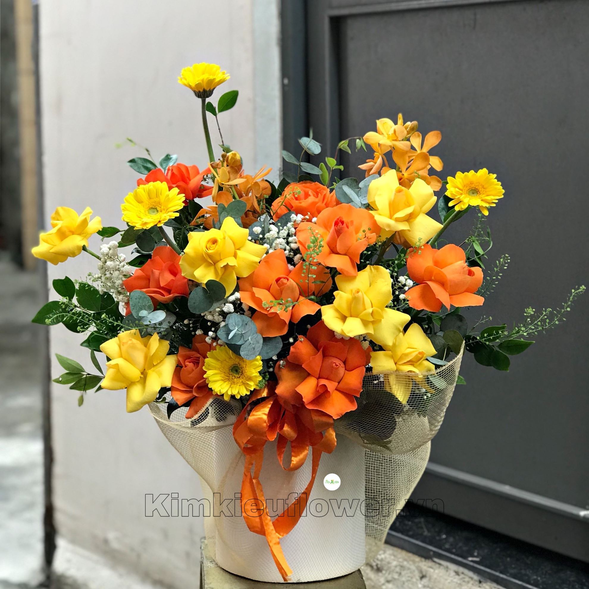 Mẫu HG363 gồm các loại hoa: + 6 hoa hồng cam lận cánh + 6 hoa hồng vàng lận cánh + 2 lan vàng + 4 đồng tiền nhí vàng + và các lá phụ khác - Liên hệ KIM KIỀU FLOWER để tư vấn thiết kế mẫu hoa theo yêu cầu bạn nhé!