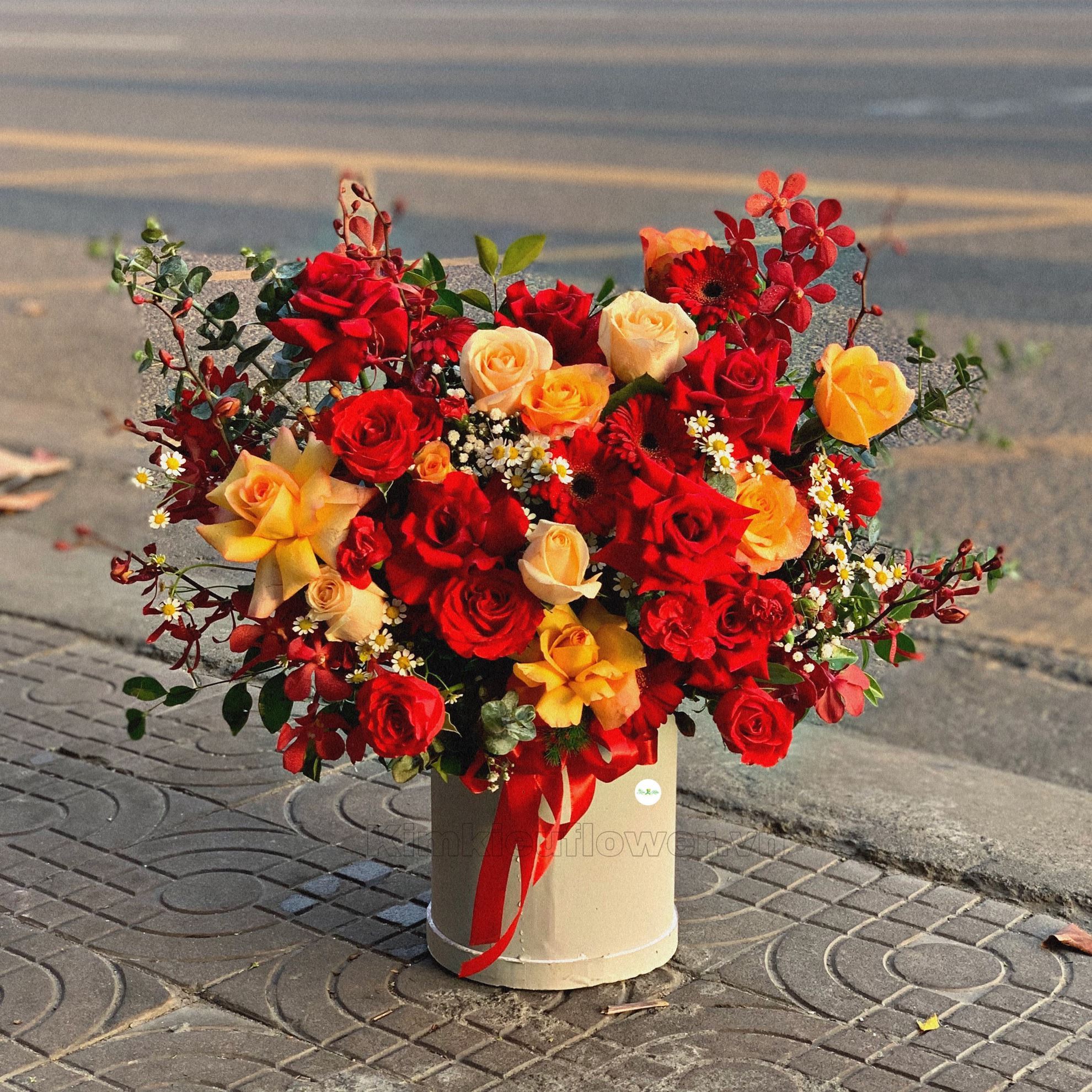 Mẫu HG305 : + hoa hồng đỏ + hoa hồng cam + lan đỏ + đồng tiền đỏ + và các hoa,lá phụ khác - Liên hệ KIM KIỀU FLOWER để tư vấn thiết kế mẫu hoa theo yêu cầu bạn nhé!