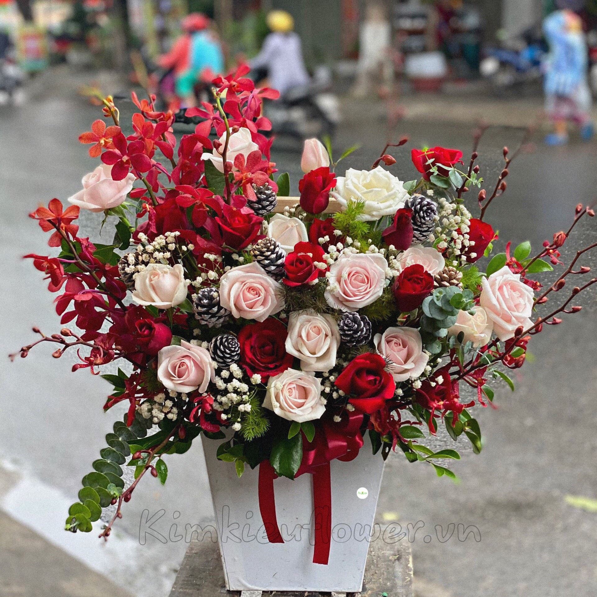Mẫu HG166 gồm các loại hoa : + hoa hồng đỏ + hoa hồng kem + lan nhện + quả thông khô + và các lá phụ khác- Liên hệ KIM KIỀU FLOWER để tư vấn thiết kế mẫu hoa theo yêu cầu bạn nhé!
