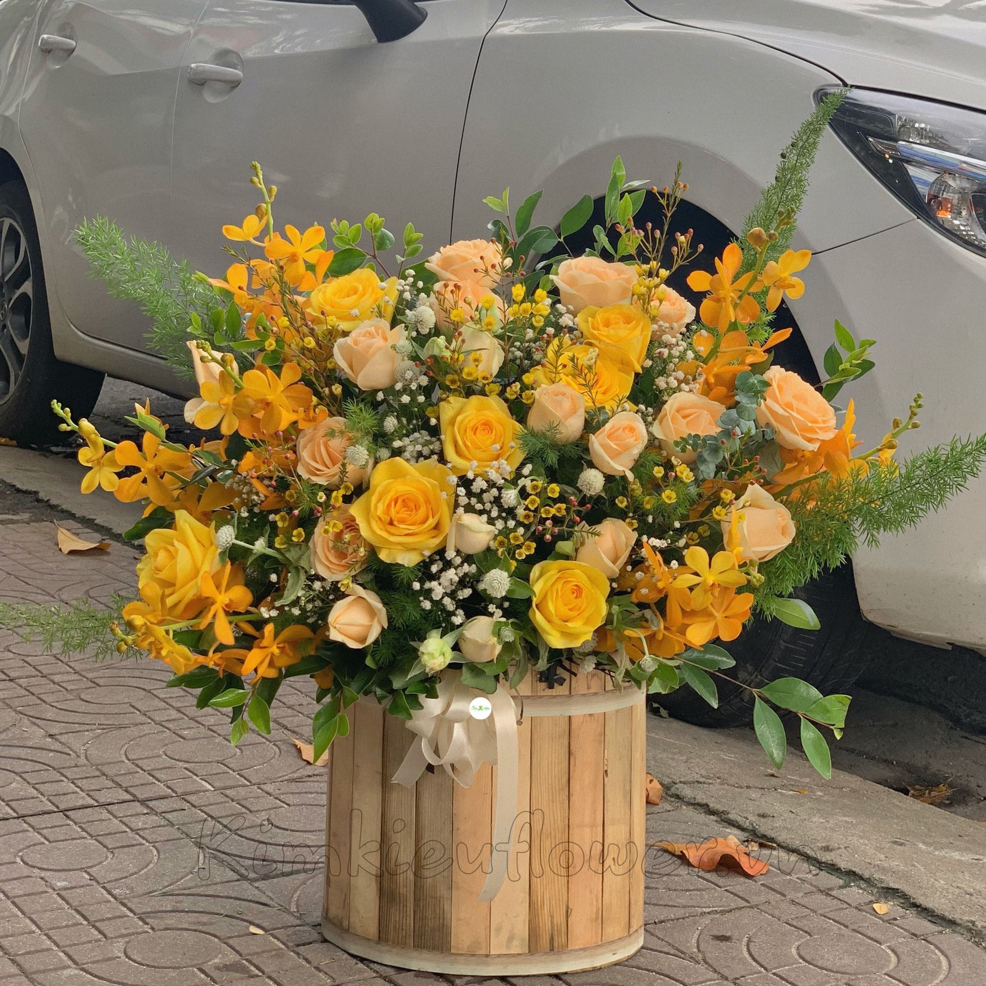 Mẫu HG158 Gồm các loại hoa: + hoa hồng vàng + hoa hồng mỡ gà + lan vàng mokara + và các lá phụ khác- Liên hệ KIM KIỀU FLOWER để tư vấn thiết kế mẫu hoa theo yêu cầu bạn nhé!