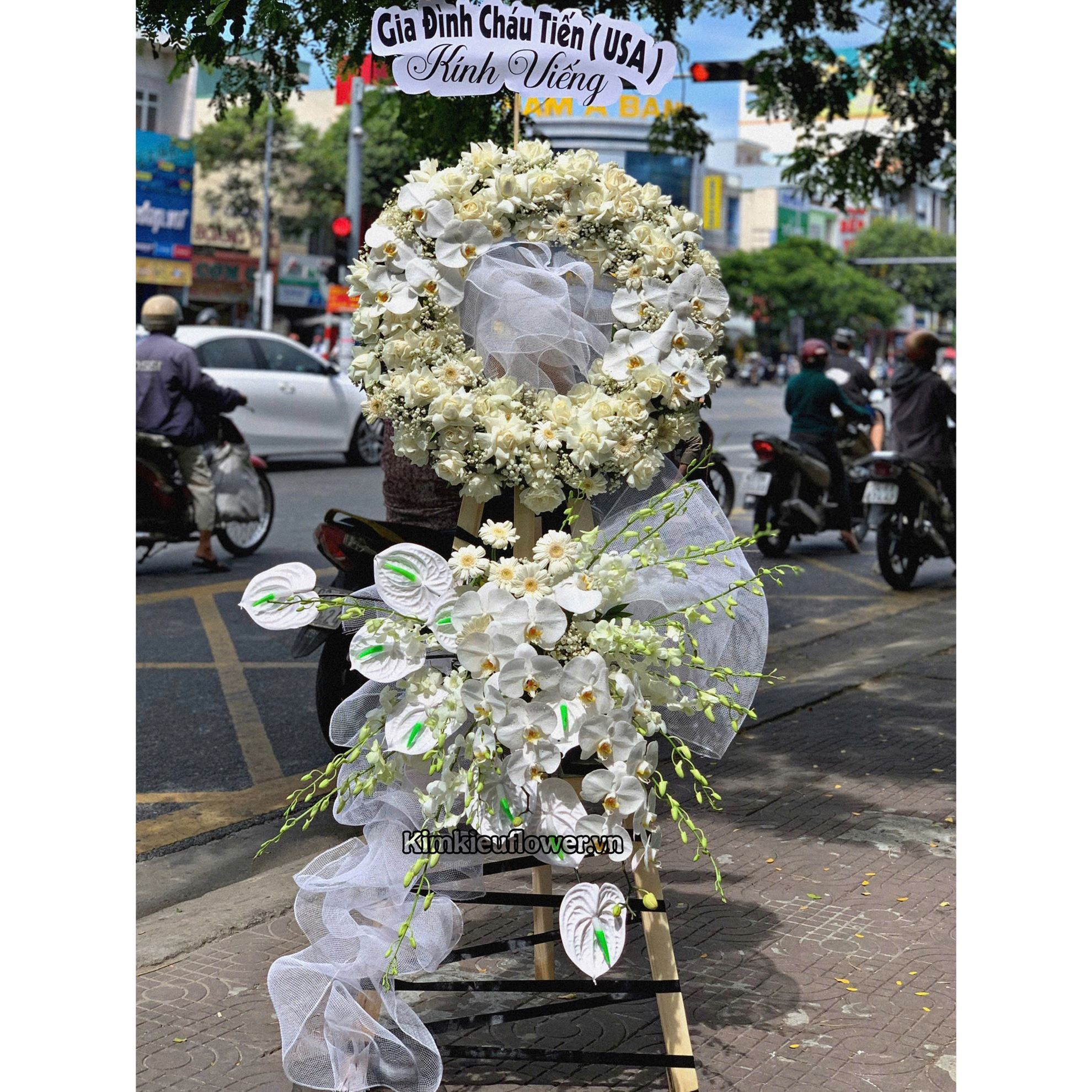 Vòng hoa chia buồn hiện đại tone trắng mix lan hồ điệp - KV317