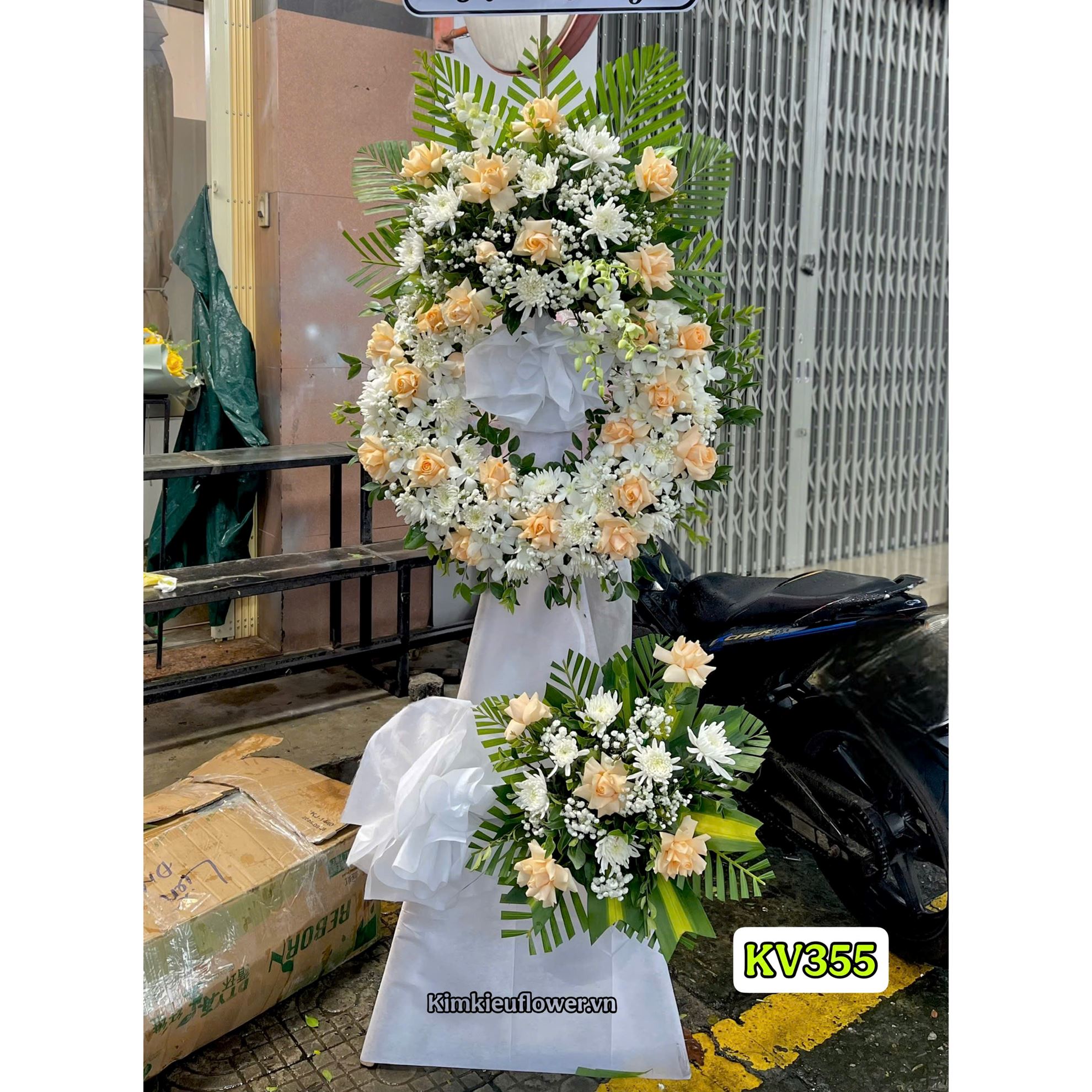 Vòng hoa chia buồn tone trắng mix hồng mỡ gà - KV355