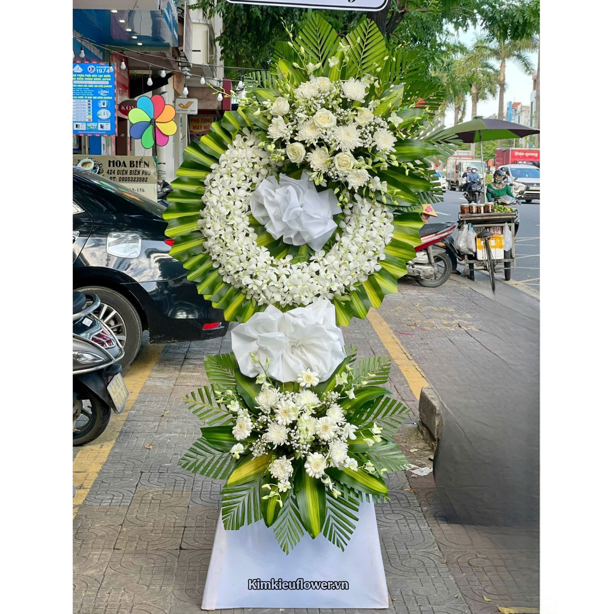 Mẫu KV336 gồm các loại hoa: + hồng trắng + lan trắng + cúc trắng + đồng tiền nhí trắng + và các lá phụ khác - Liên hệ KIM KIỀU FLOWER để tư vấn thiết kế mẫu hoa theo yêu cầu bạn nhé!