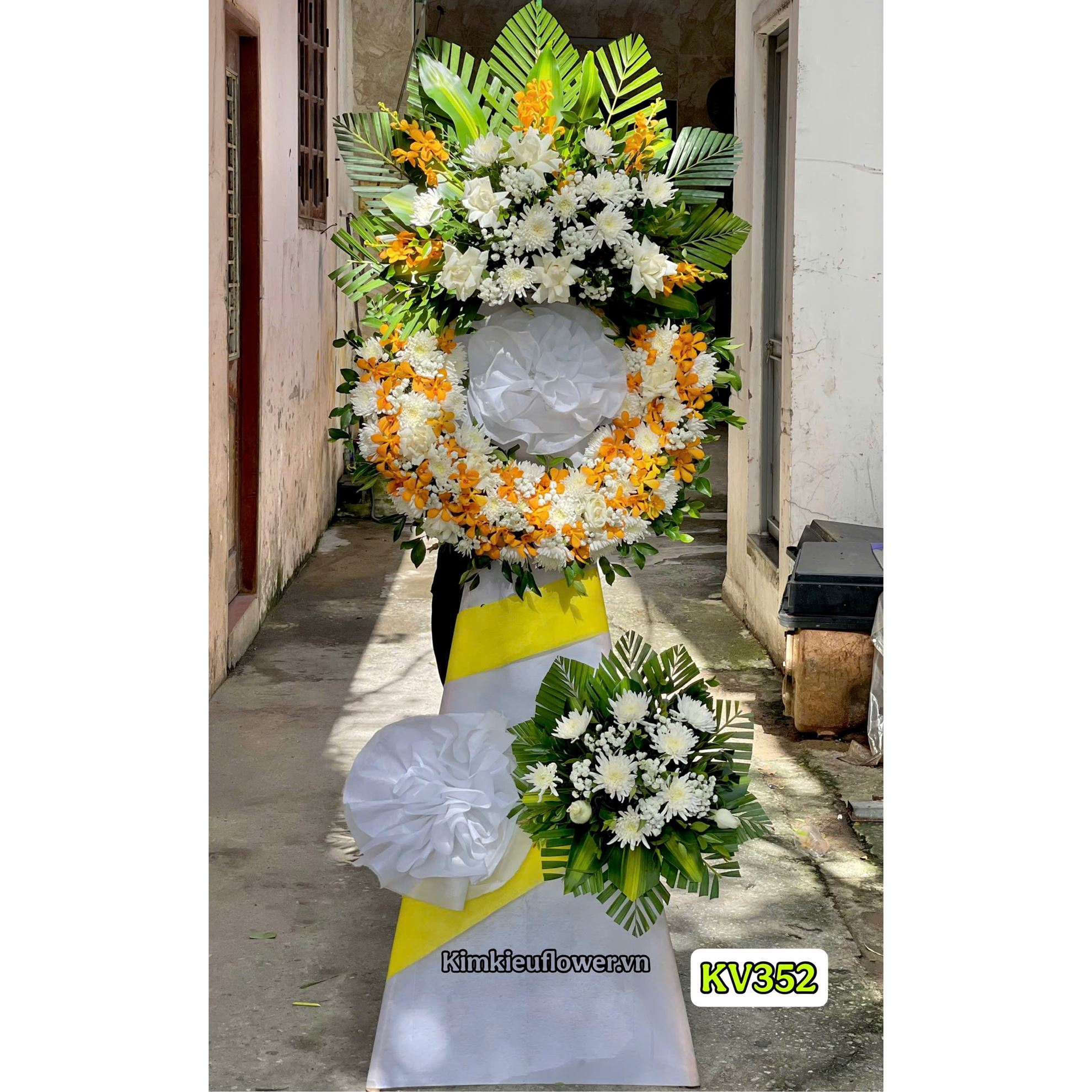 Vòng hoa chia buồn tone trắng vàng - KV352