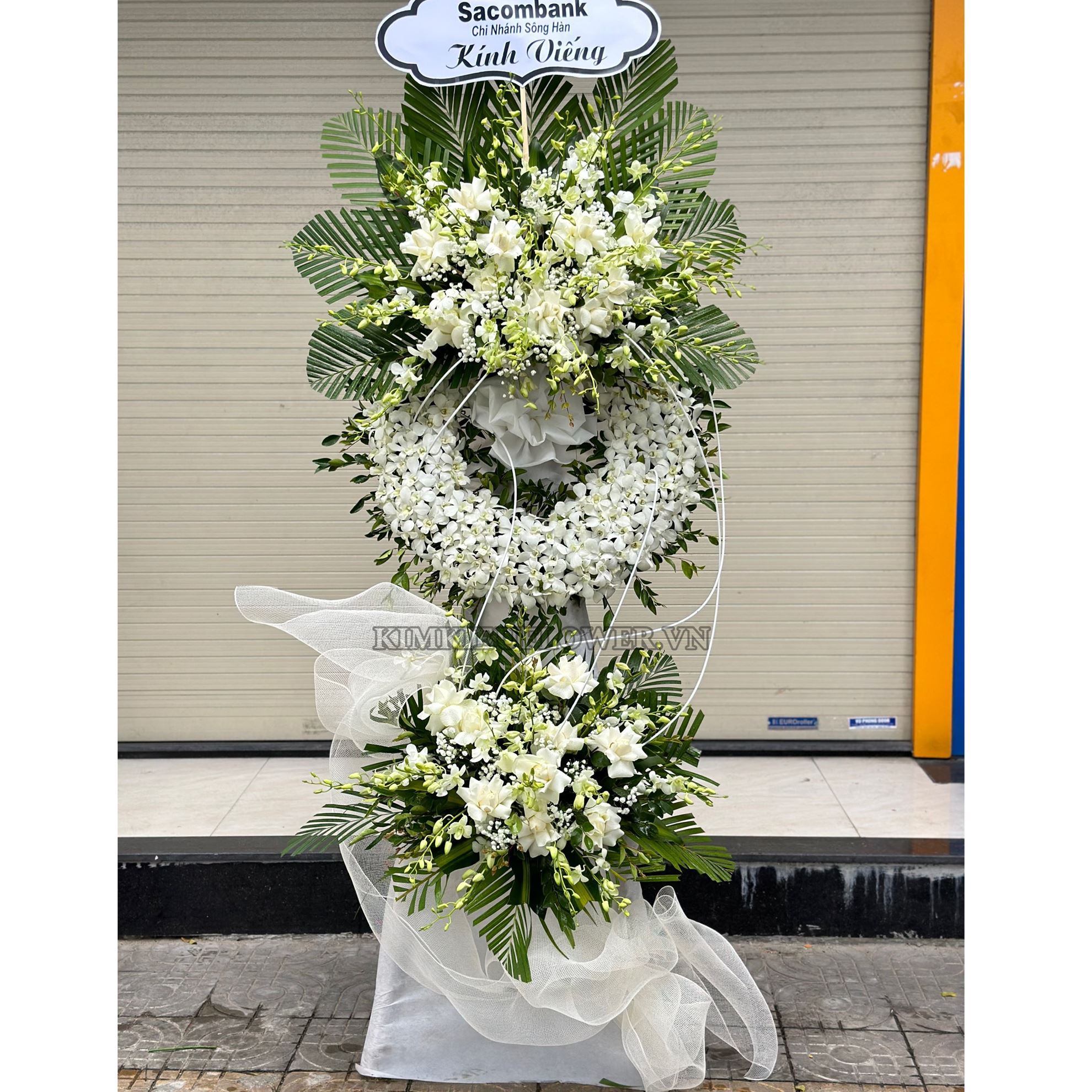 Vòng hoa KV194 gồm: + Hoa hồng trắng + Lan trắng + và các lá phụ khác - Liên hệ KIM KIỀU FLOWER để tư vấn thiết kế mẫu hoa theo yêu cầu bạn nhé!