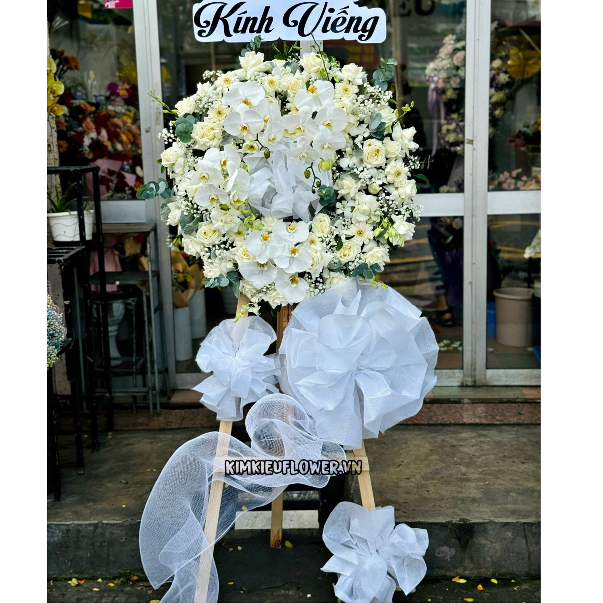 Mẫu KV233 gồm các loại hoa: + hoa lan hồ điệp trắng + hoa hồng trắng + hoa lan trắng + và các lá phụ khác - Liên hệ KIM KIỀU FLOWER để tư vấn thiết kế mẫu hoa theo yêu cầu bạn nhé!