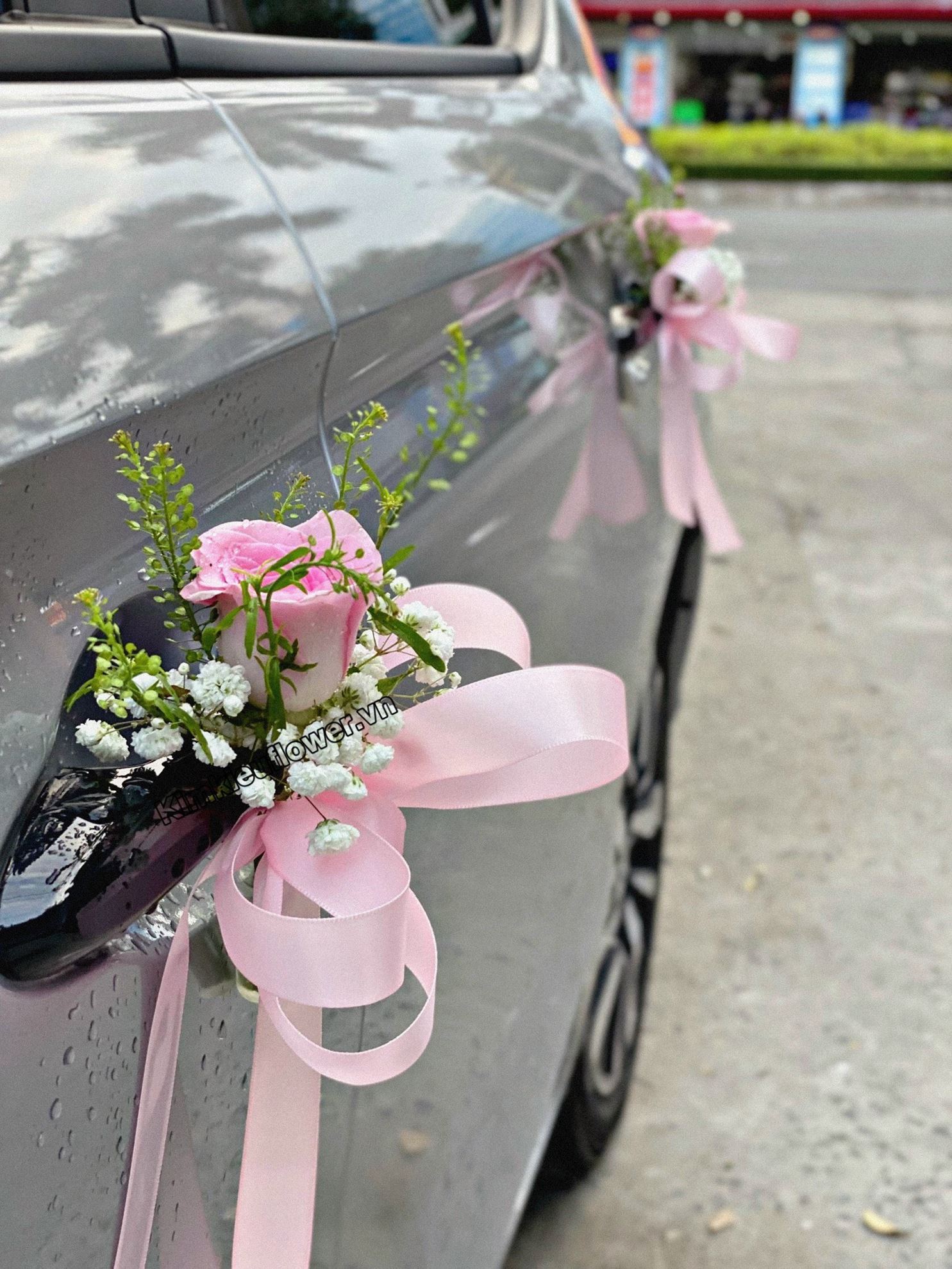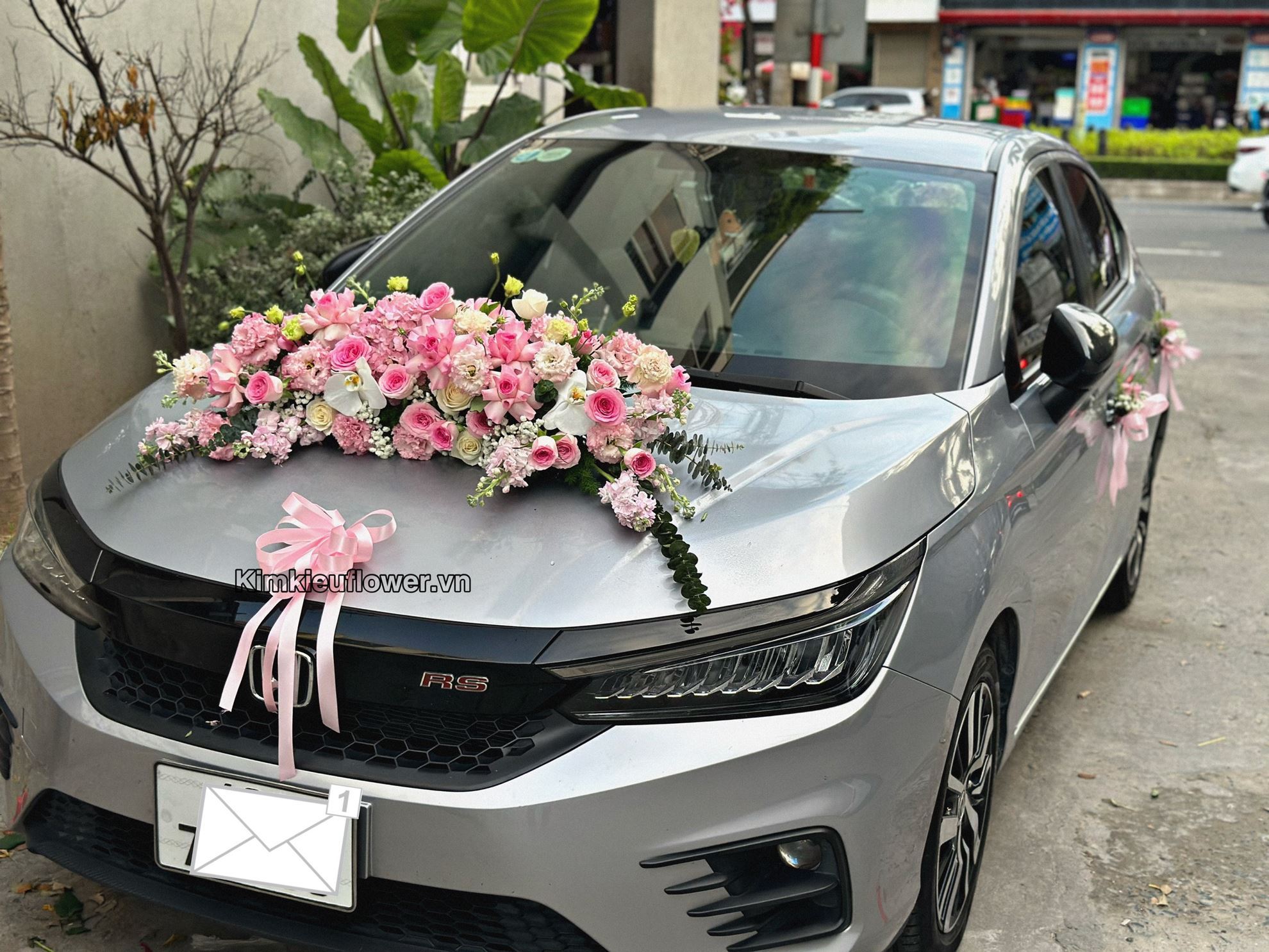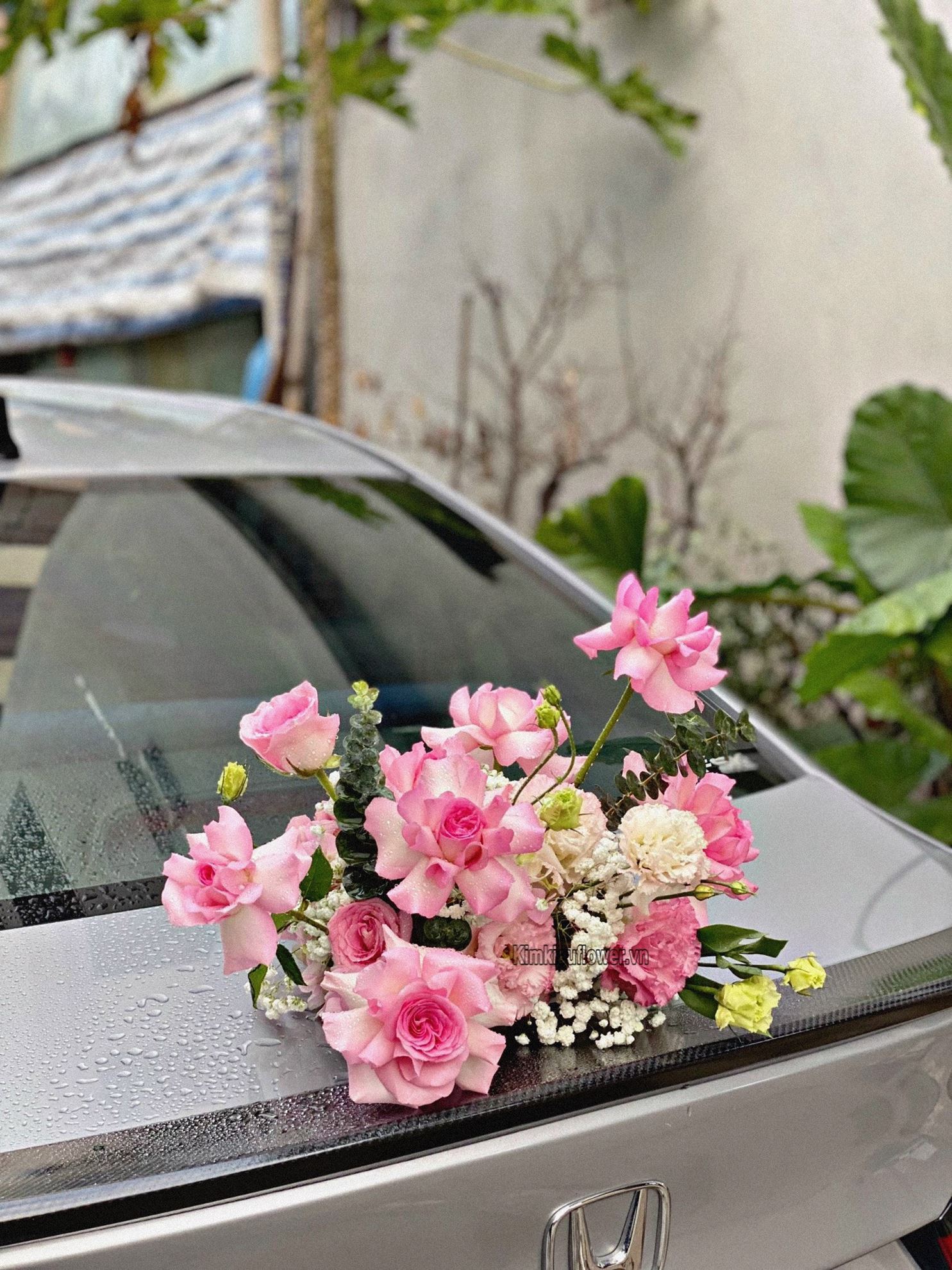 Xe hoa cưới tone hồng - HC87 + Hoa hồng lạc thần + Hoa hồng trắng + Phi yến hồng + Cát tường + và các lá phụ khác- Liên hệ KIM KIỀU FLOWER để tư vấn thiết kế mẫu hoa theo yêu cầu bạn nhé!